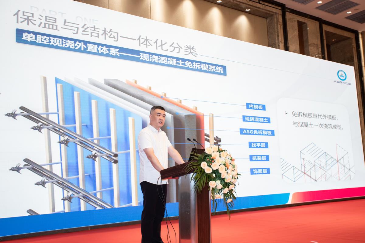 襄陽銀達銀通節能建材有限公司技術總監阮飛上臺分享ASG保溫結構一體化免拆模系統技術,包括ASG免拆模系統應用情況、技術探究、ASG免拆模系統推廣匯報。ASG免拆模系統體系優勢:自保溫、一體化、同壽命,技術革新,提升外墻保溫工程質量及安全,綜合性價比高。